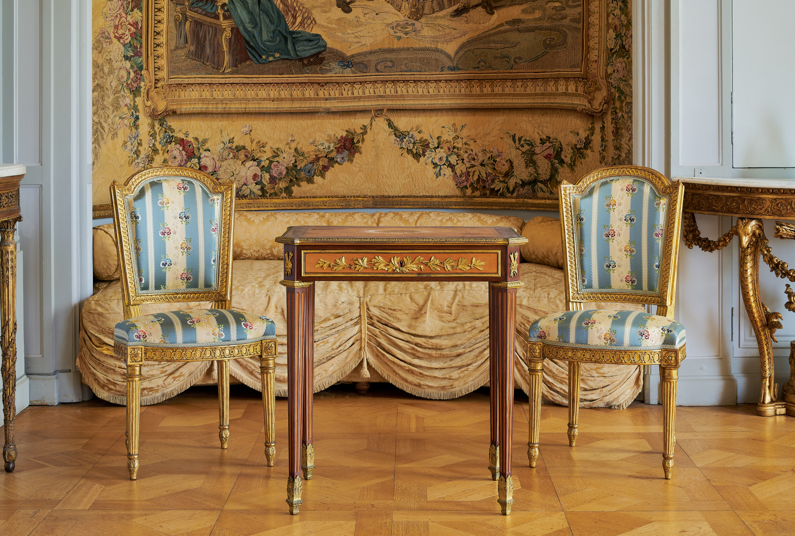 Les tables de jeu. Béatrice jouait beaucoup et à toutes sortes de jeux. Elle invitait régulièrement ses amis à des parties d'échecs, de bridge, de poker ou de tric-trac. On trouve ici une petite table de tric-trac (jeu oriental dont le nom vient du son des jetons et dont l’équivalent moderne pourrait être le backgammon) ainsi qu’une table de whist. Réalisée au XVIIIe siècle par l'ébéniste René Dubois, elle avait été offerte par Marie-Antoinette à l’une de ses amies.